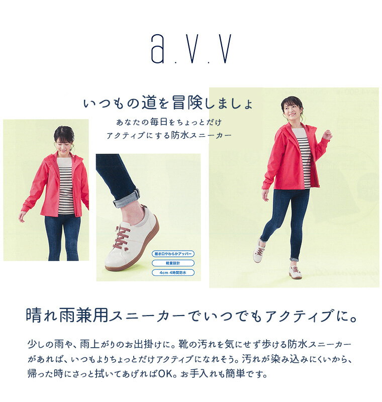 〜 あなたの毎日をちょっとだけアクティブにするa.v.vの防水シューズ 〜 4cm×4時間防水 ※完全防水ではありません。
